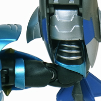 肩アーマーはボールジョイントの付いたスイング軸により跳ね上げ開閉、微調整が可能。 召喚器のない右腕の肘は90度以上曲がります。 | |
