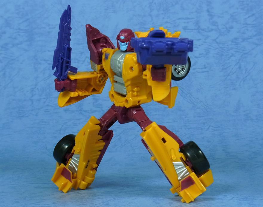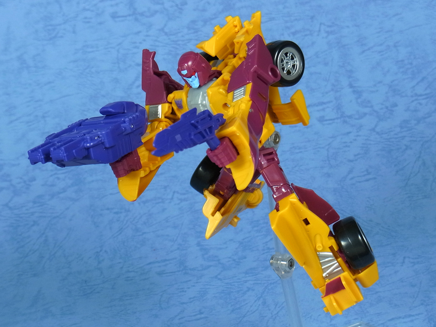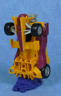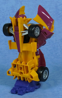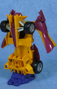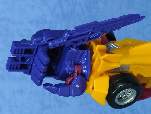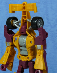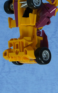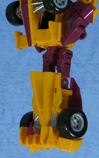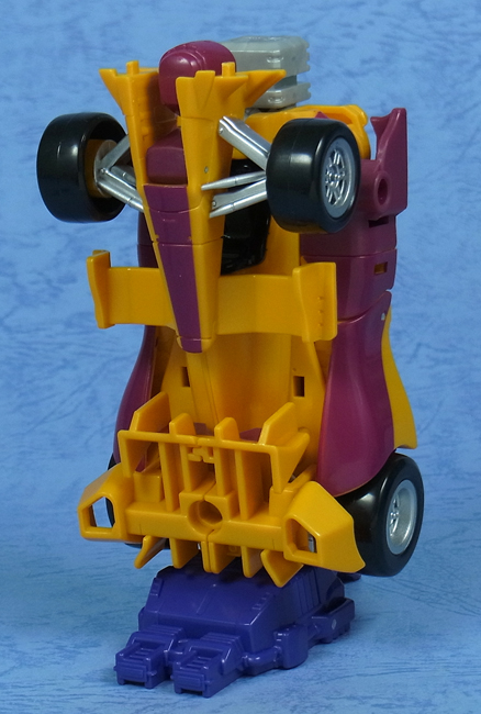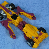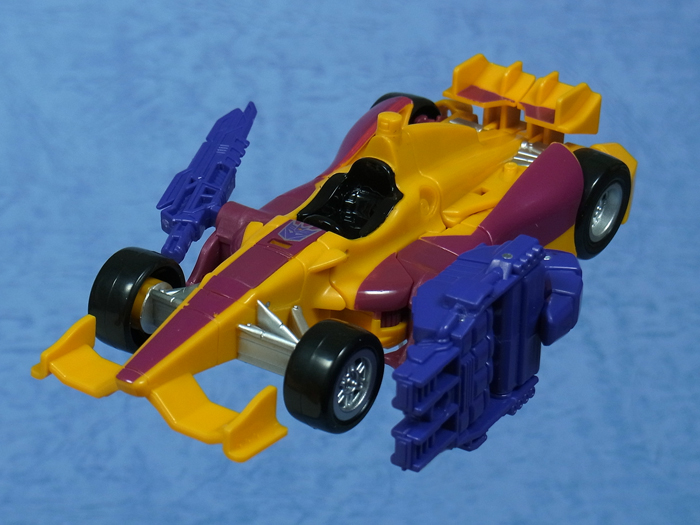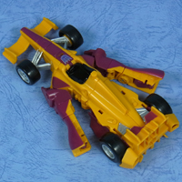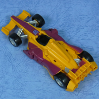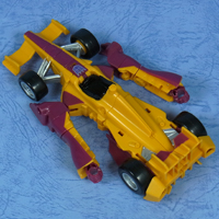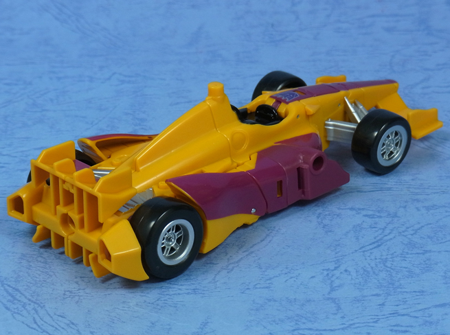 ビークルモードはフォーミュラカー風の車両。 くすんだ黄色と紫の配色が妖しい輝きを放ちます。 | |