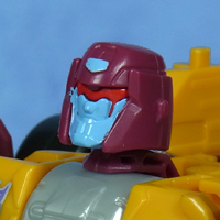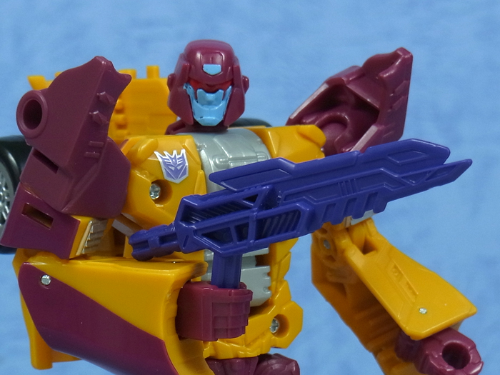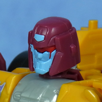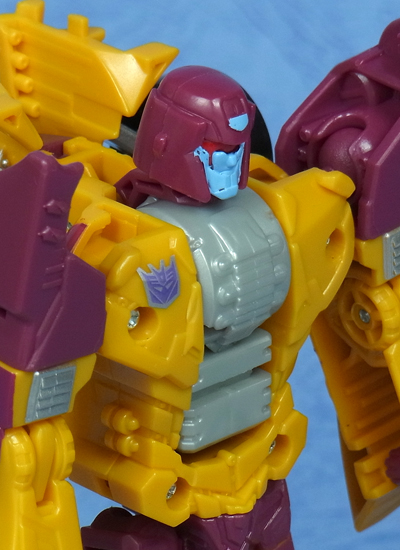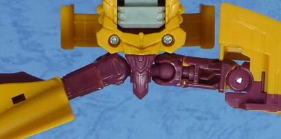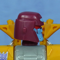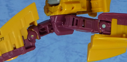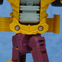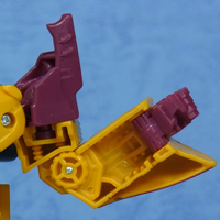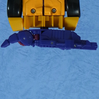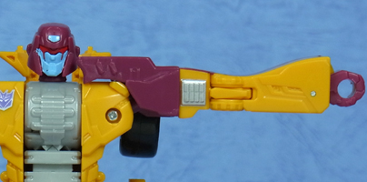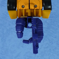 先端の連装砲は四角い見切りになっています。 拳や足に変形しますが、スタンティコンは紫色の成形色で 統一されるようです。 | |