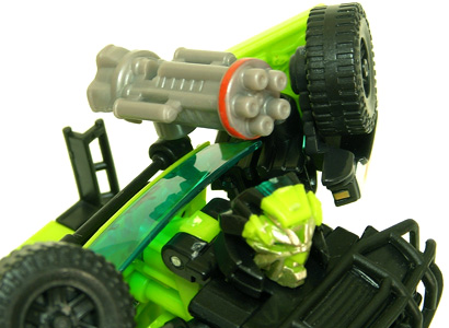 スクエアでガッシリしたボディは安定感抜群!! 鮮やかなライムグリーンとホワイトのツートーンボディに各種マーキングが施してあり、 色不足と言われるダークサイドムーン トイの中では比較的にぎやかな方。 | |