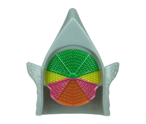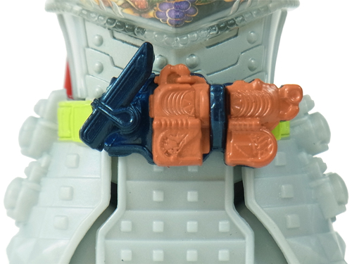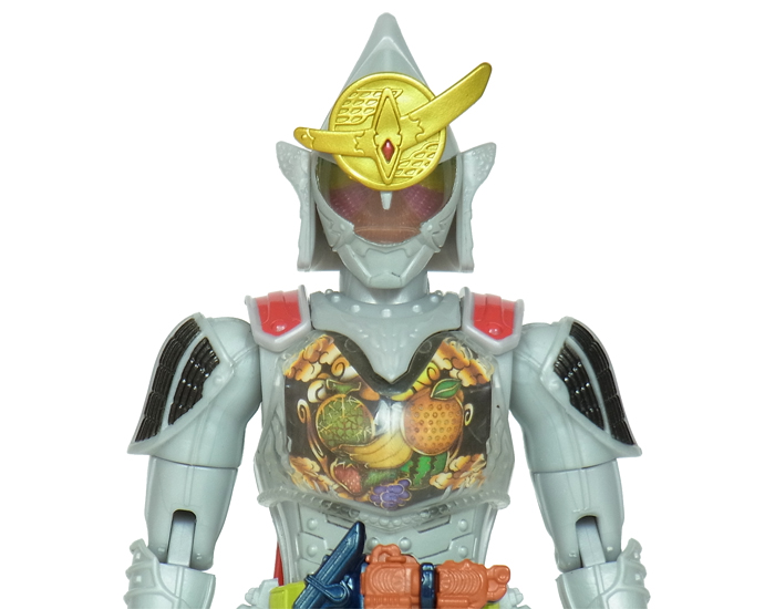胸部アーマーにもクリアパーツが用いられており、様々な果実がプリントされた シートを覆っています。 構造上小さく、細く見えてしまいますが、どこか懐かしく趣深い質感です。 | |