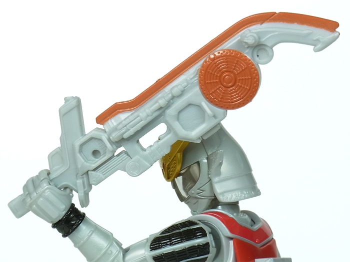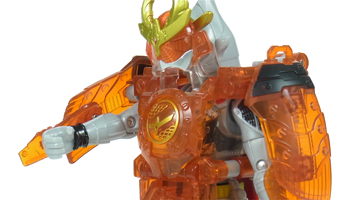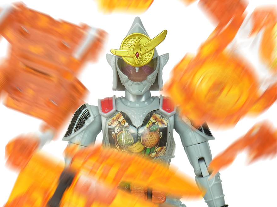 変身する刹那の爆散状態を表現するためか、オレンジのクリアパーツで 成形されたカチドキアームズ。 あくまでギミック用と割り切るべし。 | |