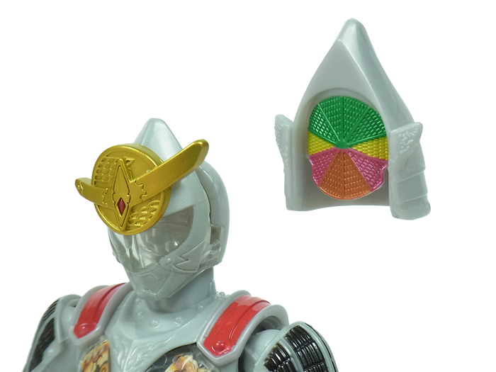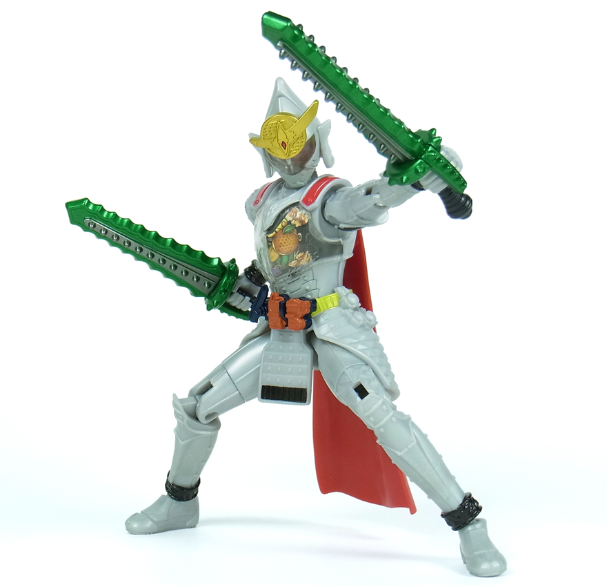 ジョイント接続された極ロックシードとカチドキロックシードが造形 されており、よく見るとライダーの顔が凹凸で表現されています。 ブレードの可動やロックシードの着脱は不可。 | |