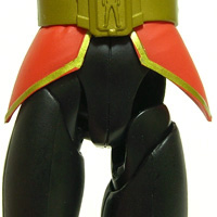 胸元のエンブレムはタンポ印刷にてくっきり仕上がり。 ベルトは輪っか状の別パーツ、裾は肩上と同じ超軟質素材製。 可動フィギュアなので難しいですが、段差の付いた分割構造は改良の余地あり。 | ||