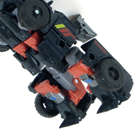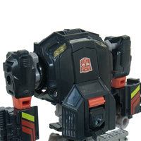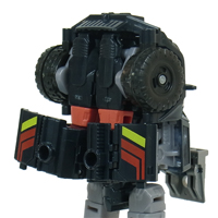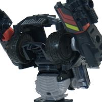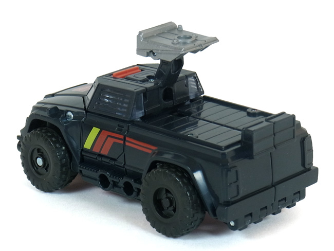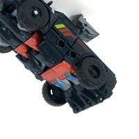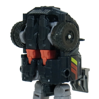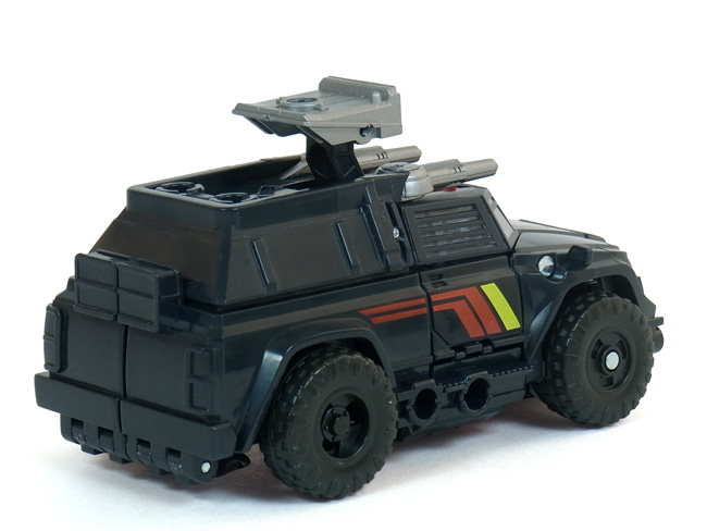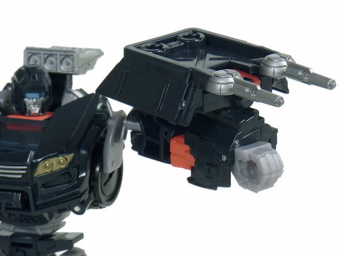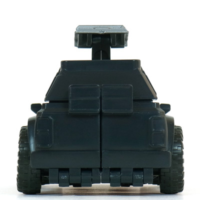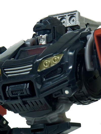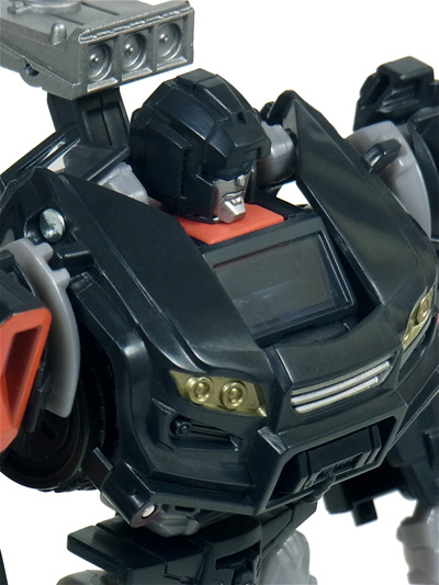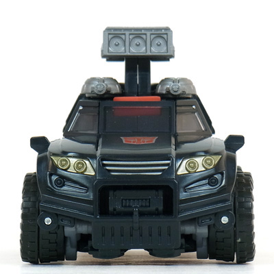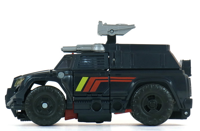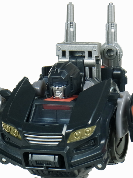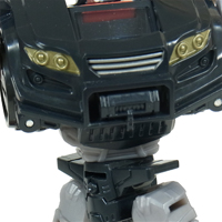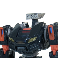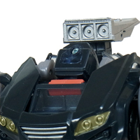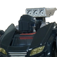 ビークルモードは重厚なフォルムを持つSUV車。 漆黒のボディとルーフに覗くブラスターが威圧感を醸し出しています。 | |