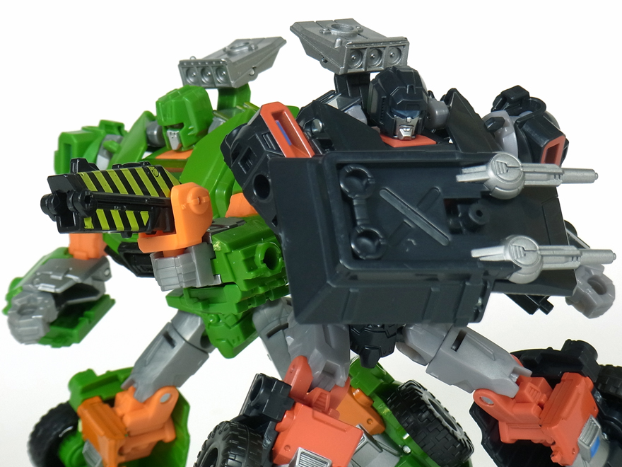 IDW オライオンパックスとロボットモードで2ショット。 胸部から上がゴツく大きめになっているので、オライオンより大分立派に見えます。 | |