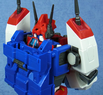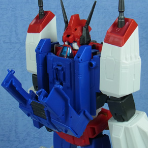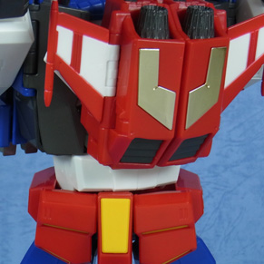 フェイスは凛々しくイメージ通り。 ぶ厚い胸板と胸元に移動したジェットノズルも絶妙なバランスで再現。 ユニークな合体ギミックとスタイリングを見事に両立させています。 | |