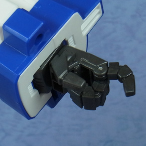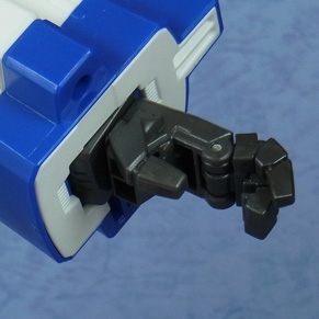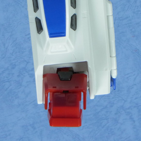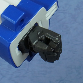 バトルヘッド下のハッチを開けてブレード(大)、(小)を収納します。 ※ロボットモードでブレード(大)を収納したまま右脚を動かすと干渉して 破損する可能性があるとのことなので、取り扱いは慎重に! | |