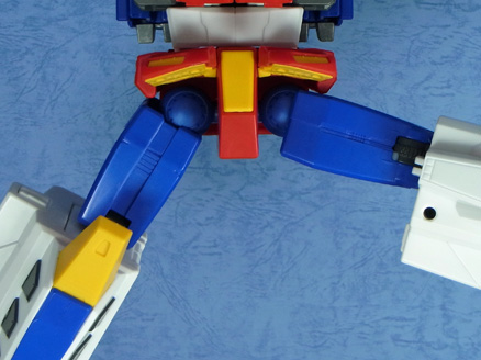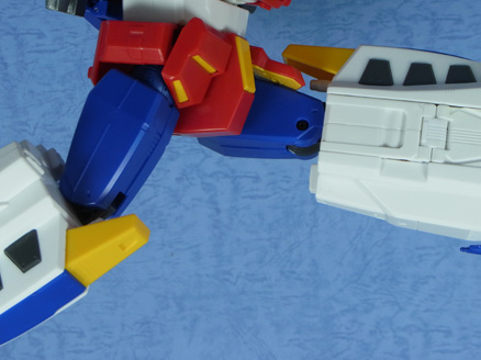 予めロボットモードに変形させたセイバーの拳を内側に引き込み、 肘部を縮めて脇を締めます。 | |
