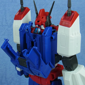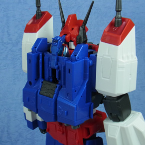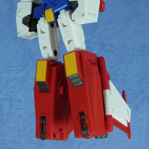 バックパックのカバーを再度閉じ、下部のパネルを反転して上部に移動させます。 セイバーレイザーと剣の束に変形するセイバージェットの機首をマウントすることができます。 | |