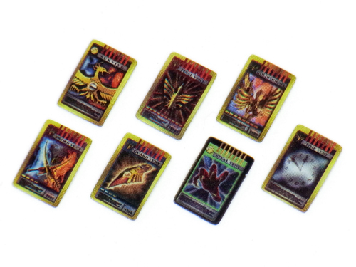 計7枚のアドベントカードが付属します。 上段向かって左から、無限(サバイブ) 、エターナルカオス(ファイナルベント)、 ゴルトフェニックス(アドベント)、タイムベント、下段 ゴルトセイバー(ソードベント)、ゴルトシールド(ガードベント)、スチールベント | |
