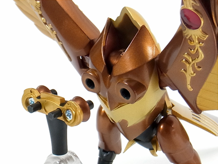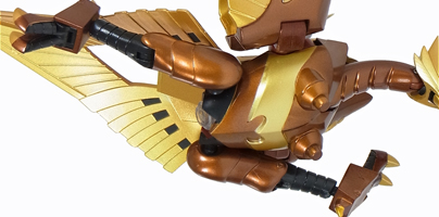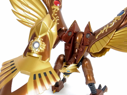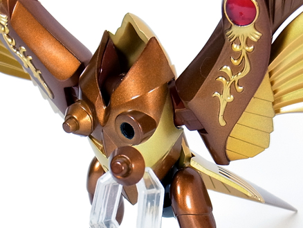 セイバー以下の羽根パーツは独立して上下に振れます。 また、付け根からははばたくように前後に動きます。 | |