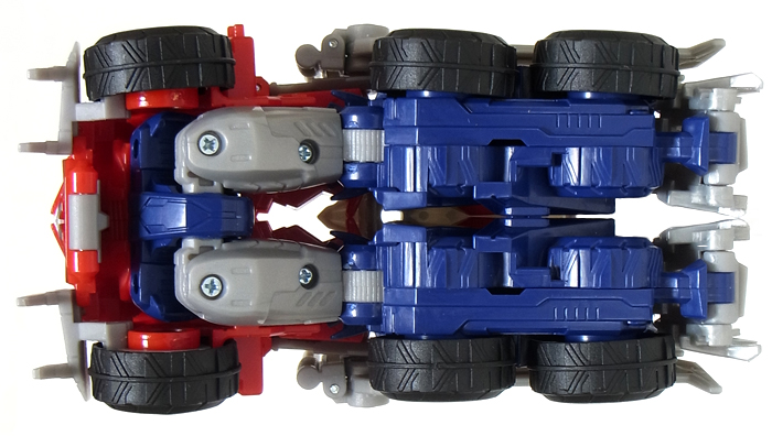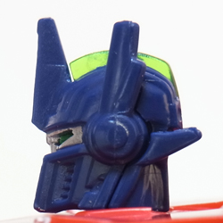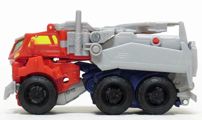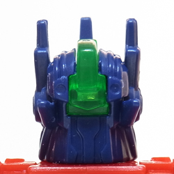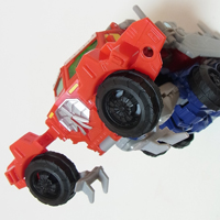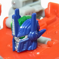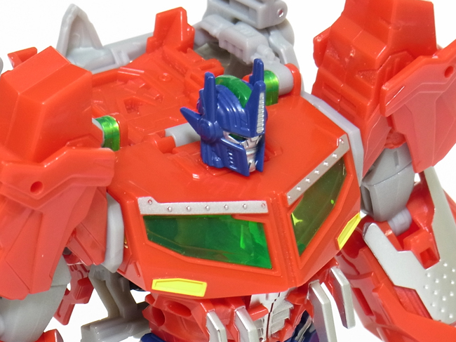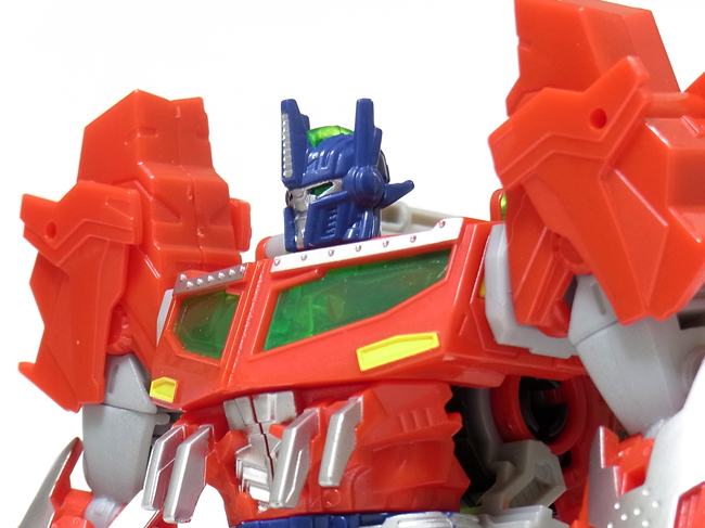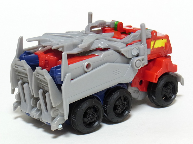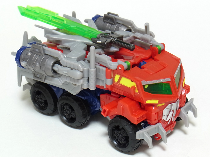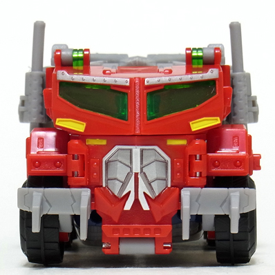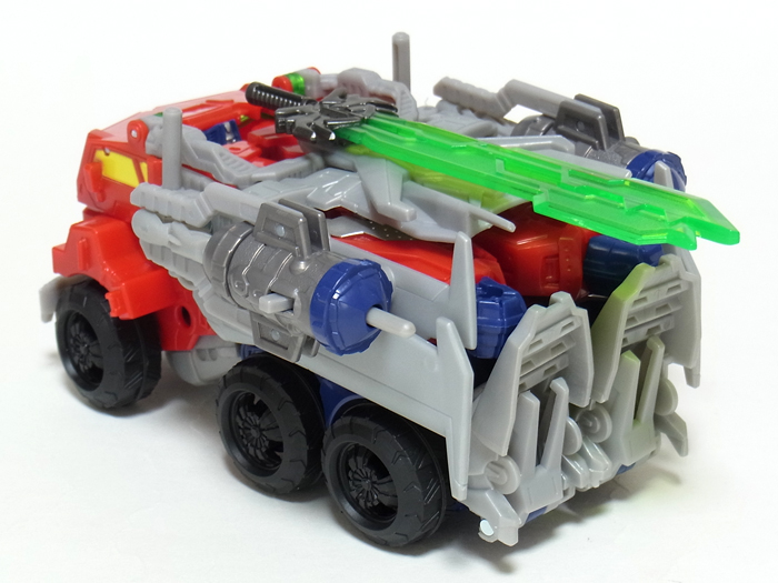 ビークルモードは、キャブオーバータイプの6輪トレーラー。 緑のクリアパーツ製フロントガラスが新鮮に映ります! | |
