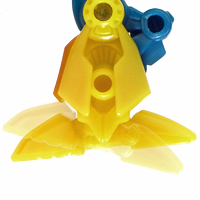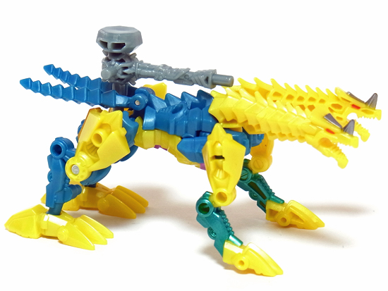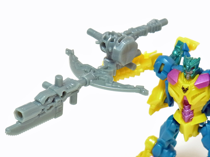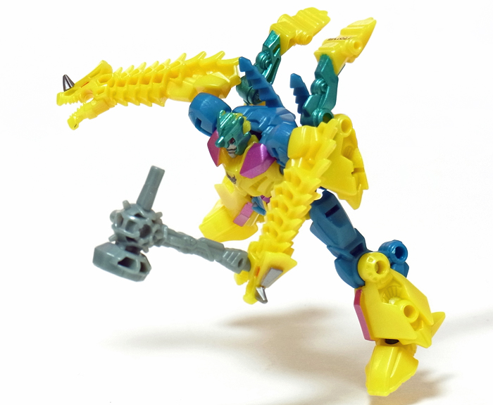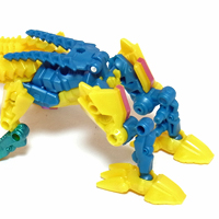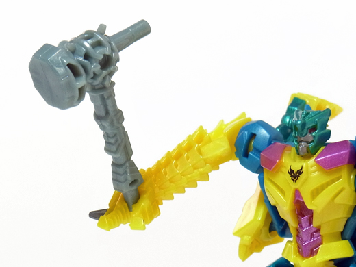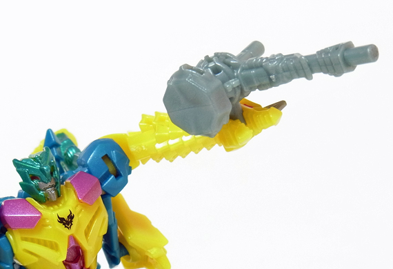 付属武器のピストンハンマーをブラスターに見立てて尻尾にセット! この他、背中や両足、そして口など、数ヶ所に取り付け可能です。 | |