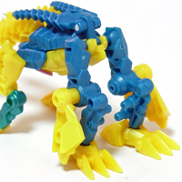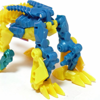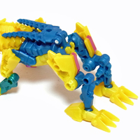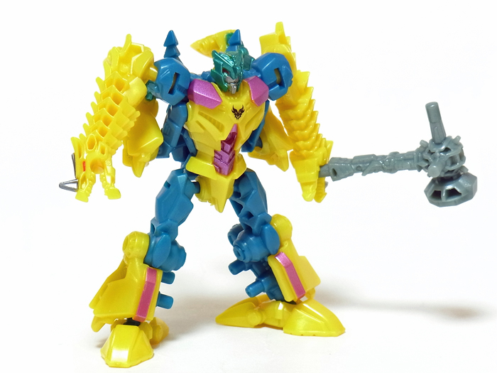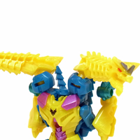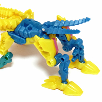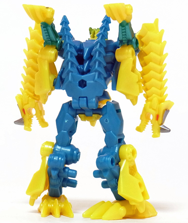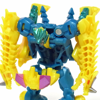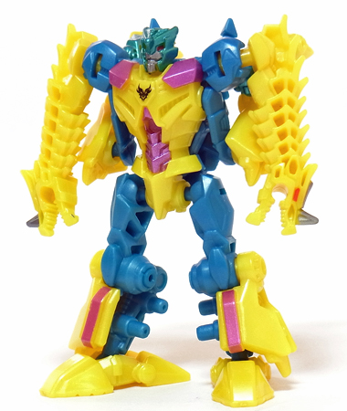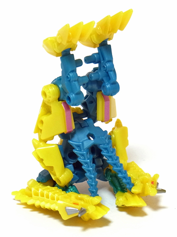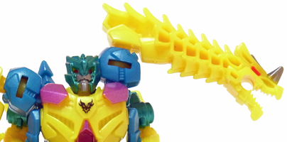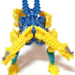 【コメント】 シンプルながらも、竜の首が両腕になるというツボを抑えたトランスフォーム! 小サイズながら、メリハリの効いた造形と加不足無い色遣い! 惜しむらくは首や肘膝が可動しないことですが、サイバーバース仕様と割り切るべきか。 総合評価は、後続のテラートロンと、彼らのオボミナスへの合体に掛かりますが、 まずはその発売を待ちましょう。 以上、サイバーバース ツインストライクのレビュー 終了!! |