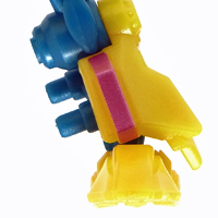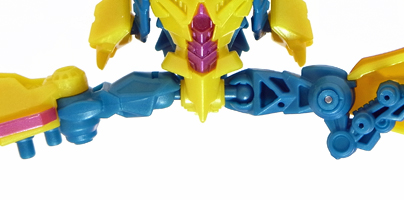 肩はボールジョイントと変形用の軸関節で可動。 腕が一体成型なので、回転軸が無いのが難点。 首、肘も固定です。 | |