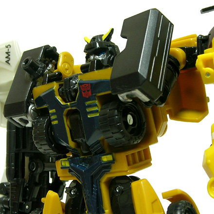 | A ボディを立ち上げて、腕を下ろし、バンパー下に収納されていた頭部を引き起こして、トランスフォーム完了。 |