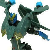 A パワーアップモードの頭部を取り出し、カバーを主翼ごと下に下します。 肘を軸関節でたたみ、胸部装甲としてボディに組み付けます。 その大外に、開かれていた尾翼部分を回し込んで固定します。 |