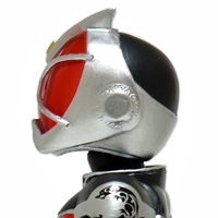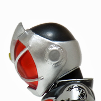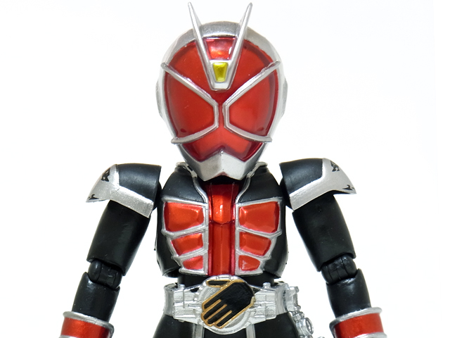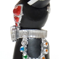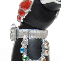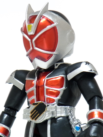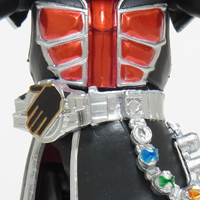 マスクはクリアパーツ製ですが、カットがヌルいためか、宝石 のような輝きとまではいきません。 胸部はメタリック塗装で処理されています。 | |