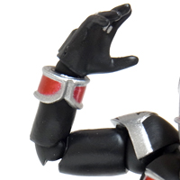 肩はボディ側に接続された小さなボールジョイントと、肩そのものとなる大きな球体関節により可動。 軟質樹脂性の肩アーマーは極小のボールジョイントにより接続され、腕の可動をできるだけスポイルしないようになっていますが、 大きく動かすとすぐに外れてしまいます。 肘は単軸で90度以上曲がり、手首は小型の球体関節により曲げ伸ばしが可能となっています。 | |
