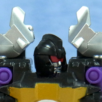 ゴーグルアイは赤塗装で、集光ギミックはありません。 円形になった胸マーク(トランスフォーマーコード)ですが、 ちょっと斜めになっていて残念。 | |