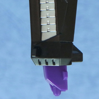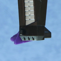 @ 上翅(羽)を後方に引いて5oジョイントを露出させ、左右に分割します。 続いて、羽表面のカバーをそれぞれ外側に90度回し、突端の紫パーツを起こして脚にします。 | |