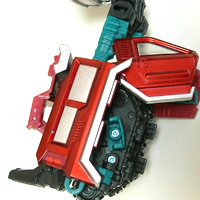 ビークルモードは後輪にクローラーを持つハーフトラックですが、これは本編未登場に終わったアニメイテッド・パーセプターのビークルモード設定を活かしたものとのこと。 海外版と異なりメッキ処理はなく、代わりにメタリック塗装が多用されていますが、特にバンパーからオーバーフェンダーに回り込んだシルバー塗装がメリハリを効かせ、よりモダンなイメージ。 | |