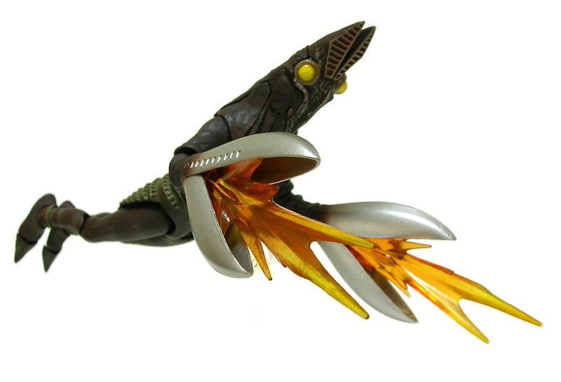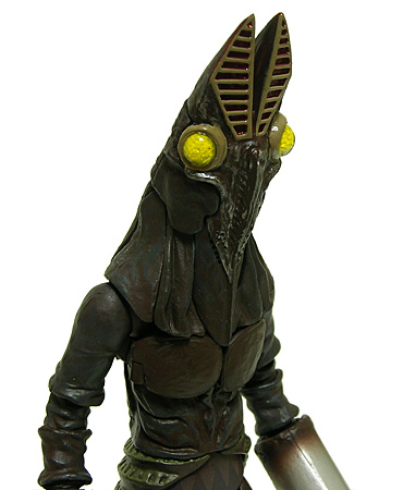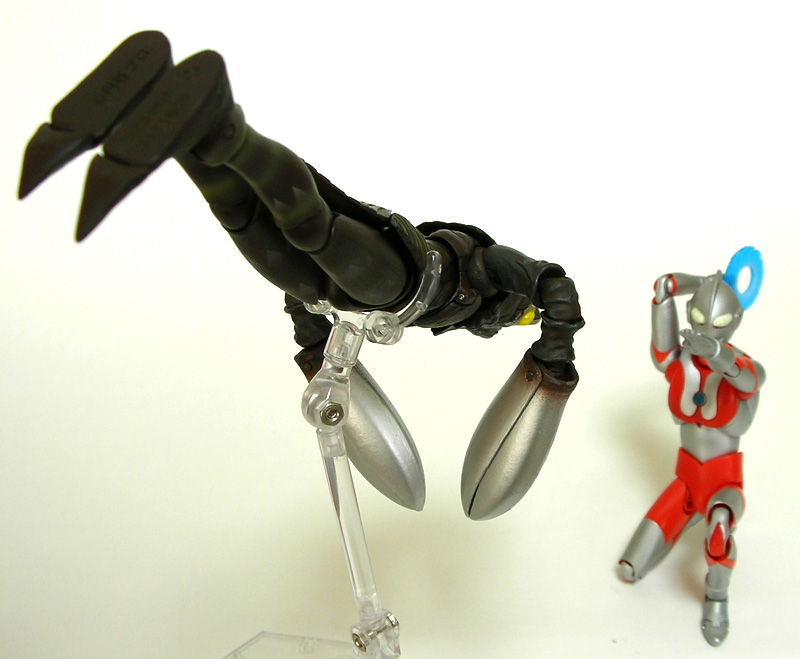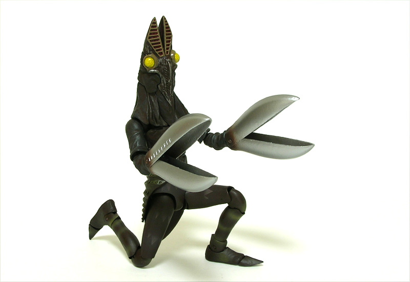 初代と比べると長体をかけたようにスマートな二代目バルタン星人が、ウルトラアクト素体を元に立体化されています。 バルタン星人には、銀灰というかもうちょっとライトな色のイメージがあったのですが、このウルトラアクト版では赤褐色っぽく見えるヘビーな仕上がり。 解釈によるものなのでしょうが、目とハサミが不気味に際立ち、怪しげな雰囲気が増していて悪くないと思います。 | |