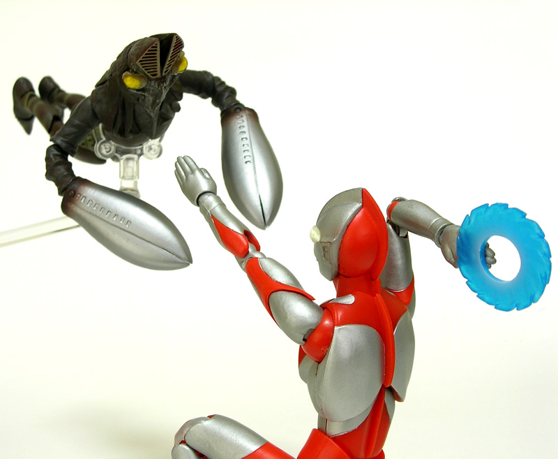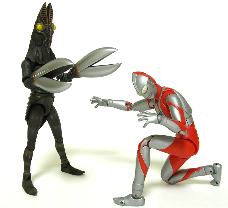 宿敵ウルトラマン(初代)と2ショット。 以前、バルタン星人の特集本で飯島敏宏監督のインタビューを読んだのですが、頭に飾りが付いたバルタンがウルトラマンより大きくならないように、身長の低い人がスーツアクターに選ばれたとのこと。 プロポーションには設定がしっかり活かされているようです。 | |