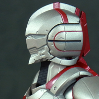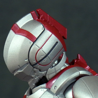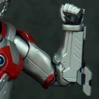【コメント】 衝撃のコミック特典フィギュアから早三年。 待望のコミック版「 ULTRAMAN 」のアクションフィギュアが、ついに発売されました! ご存知のように実写後継作でのウルトラマンは、今現在も巨大ヒーローとして脈々と描かれ続けています。 そのウルトラマンをわざわざ等身大で描くことに疑問を持たれる方もいらっしゃるようですが、 こ−いった絡め手を待ち望んでいた向きも意外と多いのではないでしょうか。 個人的にはセブンが人間サイズで異星人と対峙するシーンなんて結構好きでしたので・・・。 さて、フィギュアについてですが、ウルトラマンでありながら、メカニカルで情報量の 多い等身大ボディが、「ウルトラアクト」と「S.H.フィギュアーツ」のコラボレーションアイテムとして、巧みに アクションフィギュア化されています。 サイズや基本構造はウルトラアクトに近いようですが、金属的な質感やディテールの作り込みなど、バリエーション豊かな仮面ライダーを主軸に工夫を重ねてきたフィギュアーツからのフィードバックも反映されているようです。 スタイリングは、これはもう素晴らしいの一言! 細く絞られていく腰から力感漲る太腿アーマーへのラインなど実に艶めかしい!! サイズの都合か若干モールドが浅くのっぺりした印象を受けますが、スミ入れでも施すとメリハリが出て 見事に変身するのではないでしょうか。 あと一歩、足にダイキャストでも使っていただけたら、さらに満足感が増したように思われます。 対して可動は難多し。 最も問題なのは足首。 足首周りのアーマーの造形の都合かもしれませんが、ちょっと動かな過ぎる。 爪先が下を向くと美しく躍動的なポージングが極まるのに惜しく、接地性と安定性すらも犠牲になってしまっています。 また、後頭部と背中のヒレが干渉してしまい、大きく見上げることができません。 腰も前屈方向へほとんど倒れません。 他の部位が水準をクリアしているので尚更悔しく思います。 オプションは、まあ順当ですが、赤のカラータイマーの差し替えパーツが付属していないのが残念。 胸、腕のパーツはギッチリ着いて、外れるようなことも無くストレスを感じません。 しかし、胸の交換パーツは、もっと割り切って、大きくカッティングして可動域を確保した方が良かったのではないでしょうか。 かなり注文が多くなってしまいましたが、これも一重に期待の現われということで。 やはりセブンは何としても入手したいですね。 ついでにビクトリーやエックスも早めに欲しいぞ!! 以上、ULTRA-ACT ULTRAMAN のレビュー終了! |