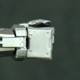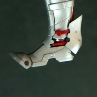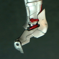 足首は固定された踵装甲が干渉するため、あまり動きません。 ただ、足首の左右軸と爪先の上下軸があるため接地性はそれほど酷くはないように感じられます。 | |