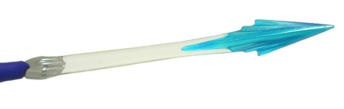 直線と鋭角で象られた光弾本体はメタリック塗装され、俊敏なイメージ。 光弾と手の接続部分は無色クリアの地がそのまま活かされています。 左右両手から放てる設定ですが、右だけが付属します。 | ||