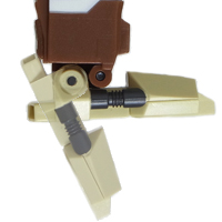 腿の付け根に回転軸あり。 膝は単軸で90度ほど曲がります。 足首は軸で前後に動かすことができますが、左右に振ることができないので、接地性は今一つ。 | |