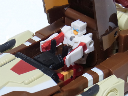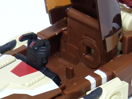 レーザーを起こしてスペースを作り、キャビンを開き、 操縦桿を上げてフィギュアを乗り込ませます。 シンプルですがインパネも塗装処理。 | |
